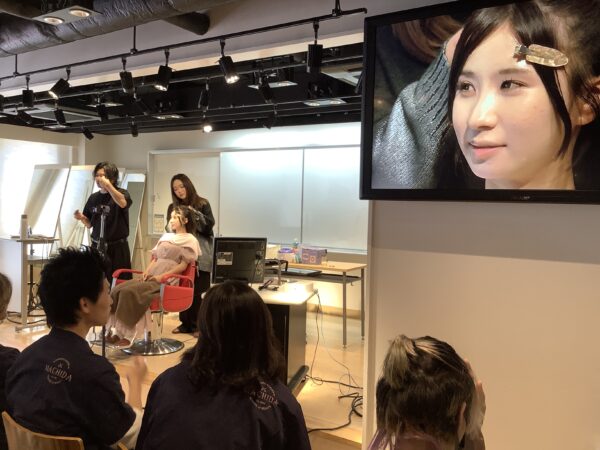 ヘアメイク業界で活躍されている、istさんのヘアメイクのデモストレーションを1年生は見させて頂きました(o^^o) 初めに眉のケア(アイブロウワックス)のデモです! 最近では眉のメニューも増えてるみたいで、男性の専門店もあるそうです。 眉ケアの後は、ヘアメイクのデモです。 ヘアメイクのプロの技術を近
